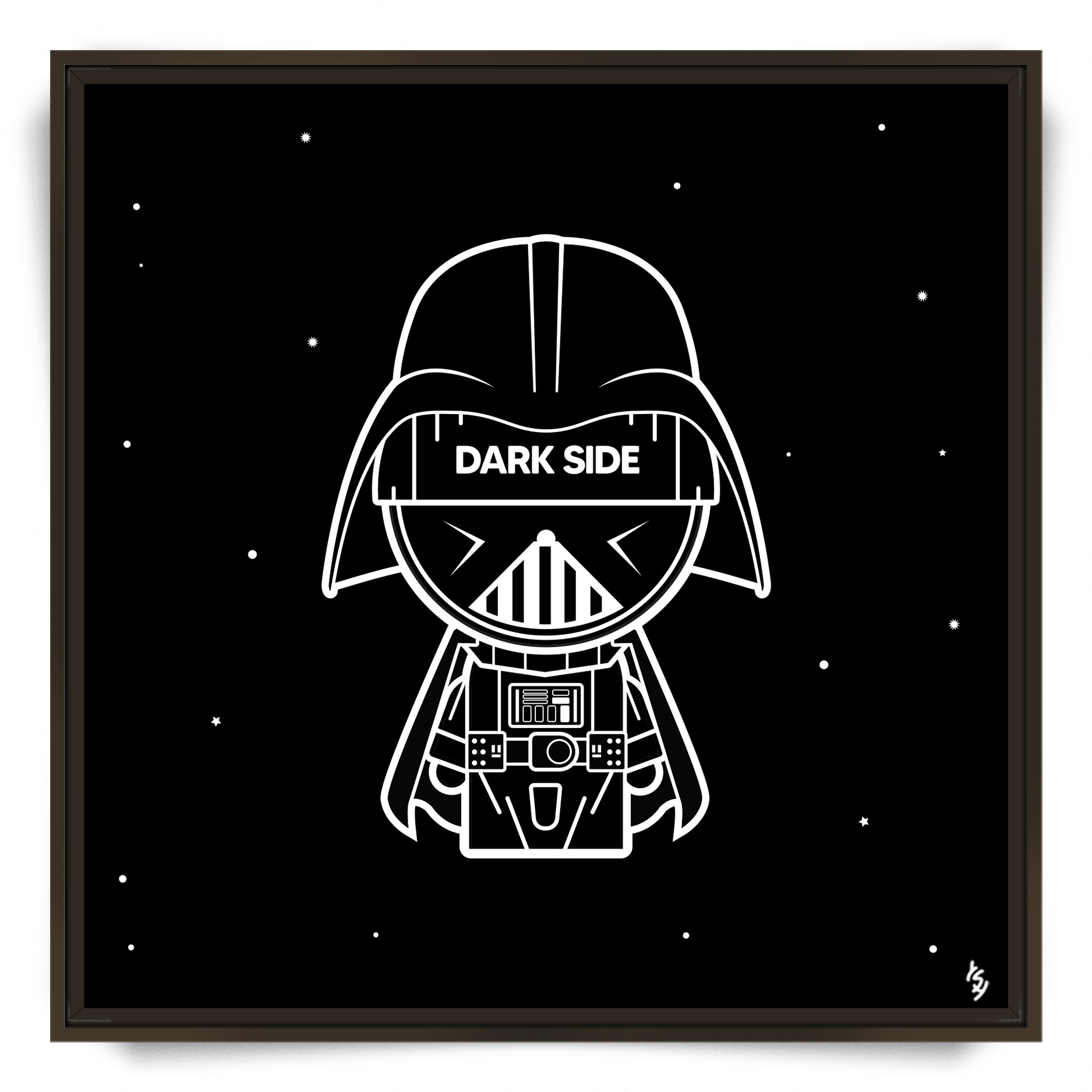 YSY a créé une œuvre minimaliste et saisissante qui nous plonge dans les profondeurs de la galaxie, capturant toute la puissance froide et le mystère du Seigneur Noir des Sith. Cette composition en noir et blanc pur célèbre l’esthétique intemporelle de la saga Star Wars.