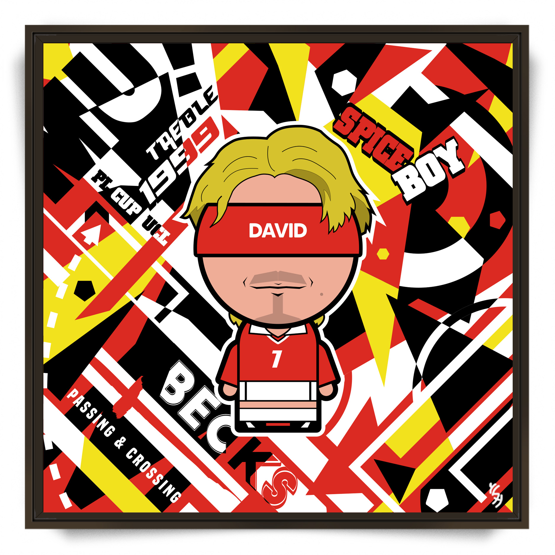 Une trajectoire graphique fulgurante qui fige l’élégance de David Beckham au cœur de l’épopée de 1999, entre le rouge sang de Manchester et les éclats dorés de la gloire du « Spice Boy ».