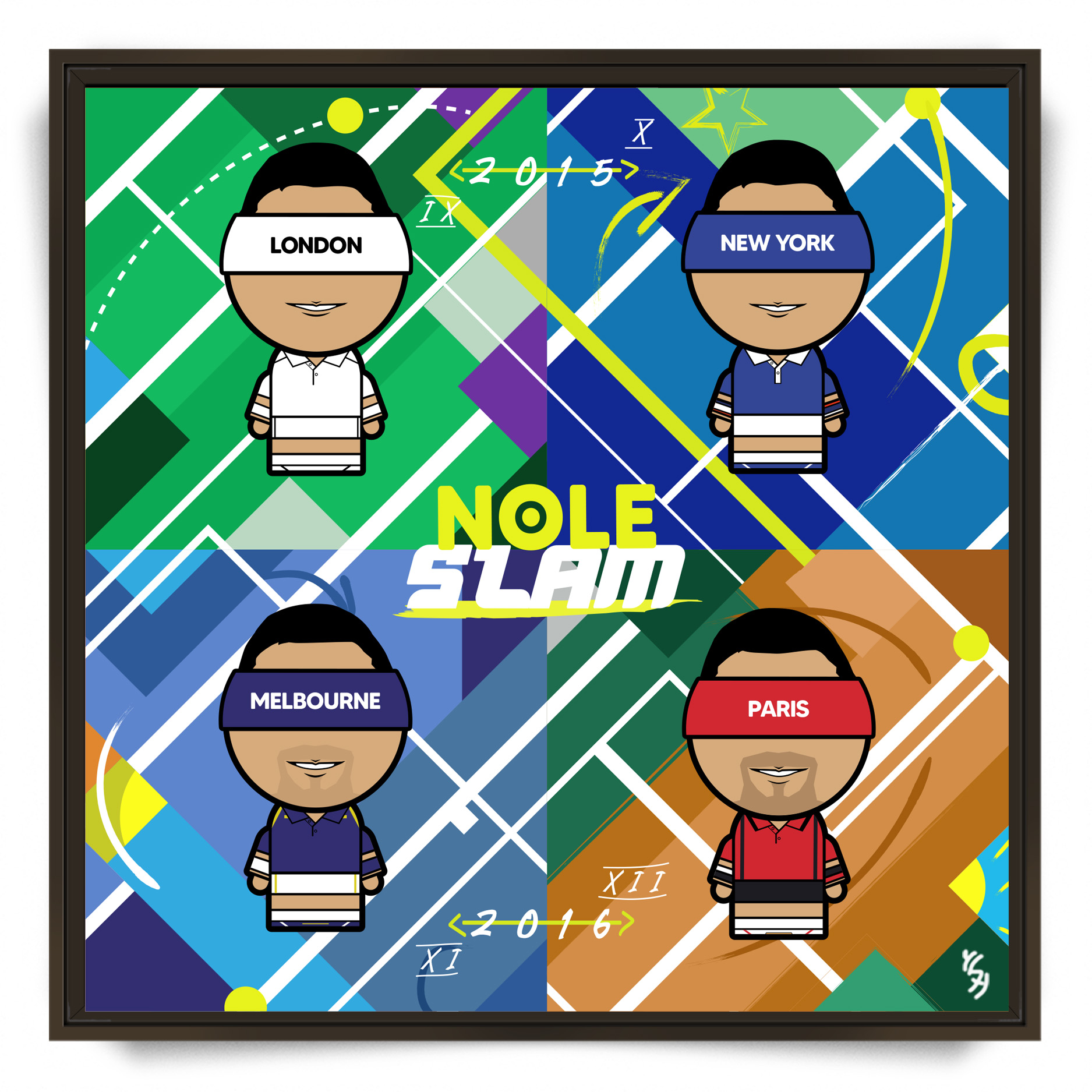 YSY a imaginé une œuvre magistrale qui célèbre l’exploit historique du « Nole Slam », immortalisant la période entre 2015 et 2016 où Novak Djokovic a détenu simultanément les quatre titres du Grand Chelem. Cette composition en quatre quadrants illustre la domination totale du Serbe sur toutes les surfaces du circuit mondial.