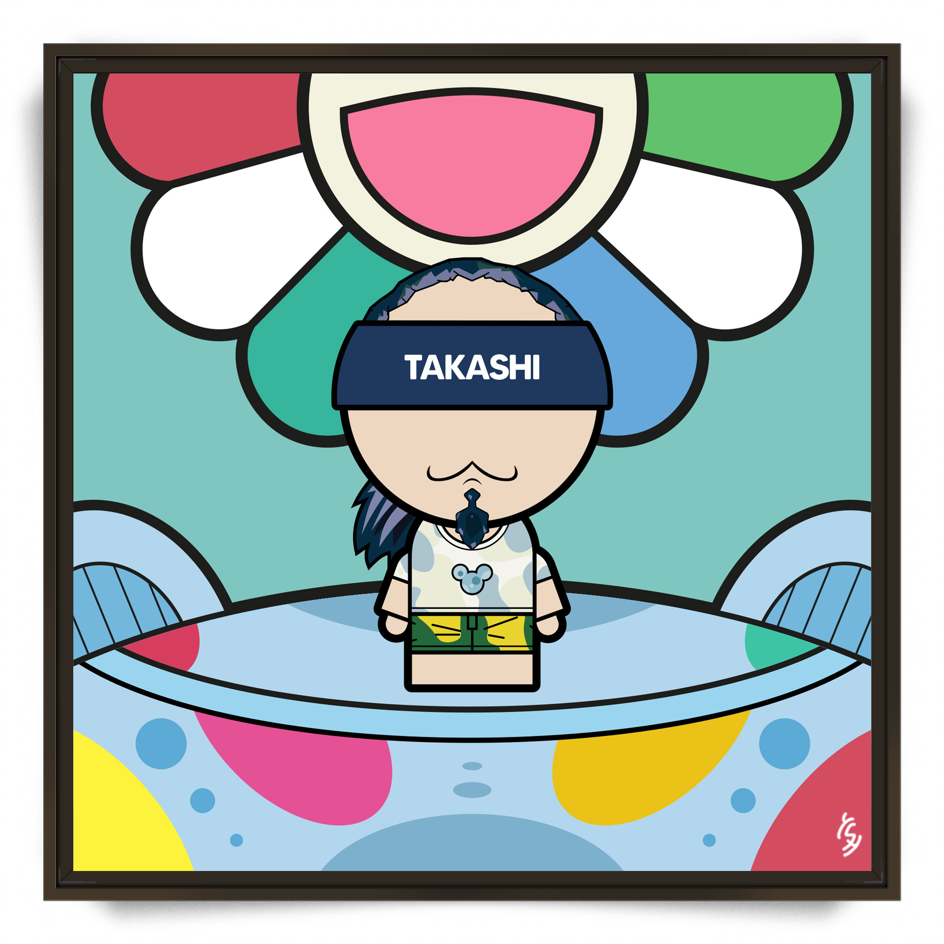 YSY a créé une œuvre pétillante qui nous plonge dans l’univers « Superflat » de Takashi Murakami, où l’art traditionnel japonais rencontre la culture pop moderne. Cette composition ludique célèbre l’un des artistes les plus influents de notre époque, maître de l’esthétique kawaii et colorée.